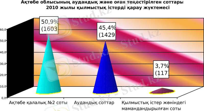 Сонымен қатар, судьялар жүктемесінің нормативтік жүктемеден едәуір асуы әлі де сақталуда. Әсіресе, бұл жағдай қалалық №2 сотына тән. Статистикалық мәліметтерге сүйенсек, қалалық №2 сотымен қаралған істердің саны жалпы облыс соттарымен қаралған істер санының (3149) 50, 9 пайызын құрады. Яғни облыс бойынша қаралған қылмыстық істердің басым бөлігі қалалық сотта қаралған (1603) . Сонымен қатар, мамандандырылған ауданаралық қылмыстық істер жөніндегі сотымен қаралған 117 қылмыстық істің 17-і немесе 14, 5% алқа билердің қатысуымен қаралған.