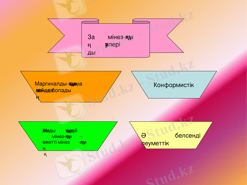 1. Маргиналдық (маргинал-аралық) мінез-құлық - бұл мінез-құлық, бәрінен бұрын, заң бойынша жазаланудан қорқу мен өз есебінен жаңылып қалмау мақсатына негізделеді. Маргиналдық мінез-құлықты адамдар қай-сы сәтте де болса заңды оп-оңай аттайды (бұзады), сәті келсе, ыңғайлы жағдай туа қалса, құқықтық талаптарды дайын тұрады;