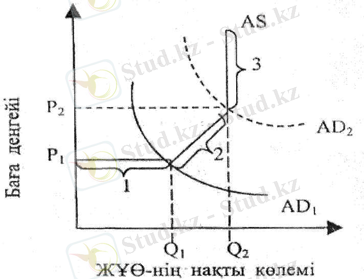 Жоғарыда келтірілген себептерге байланысты ақша массасының өсуі жалпы сұраным сызығын солдан оңға қарай жылжытады (АD 1 - AD 2 ) және, экономика жалпы ұсыным қисығының аралық (2) немесе классикалық (3) үзіндісінде болса, бұл баға деңгейін арттырады (Р 1 - Р 2 ), яғни инфляция қалыптасады.
