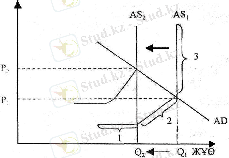 Айтылған себептерге байланысты өндіріс шығындары өседі, жалпы ұсыным қисығы солға қарай жылжиды (АS 2 - АS 1 ), баға деңгейі өседі (Р 1 - Р 2 ), өндіріс көлемі қысқарады (Q 2 - Q 1 ), яғни ЖҰӨ-нің нақты көлемі қысқарады.