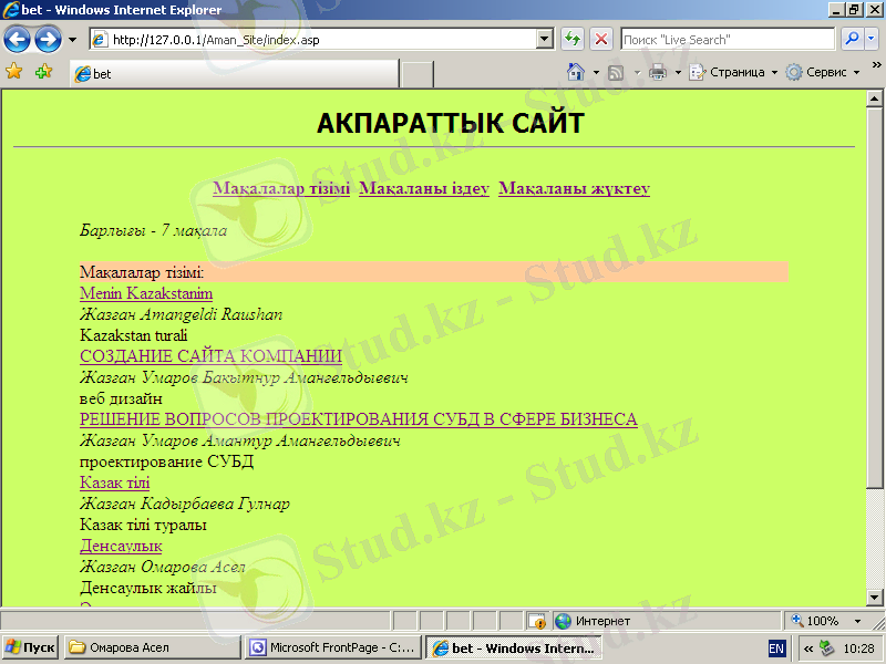 Негізгі бет әдетте index. asp деп белгіленеді. Осы беттің бағдарламалау кодына тоқталайық. Қалған беттердің коды, құрылымы осыған ұқсас болады. Төменде сайттың МҚ-мен байланысы ASP скриптісі арқылы берілген: