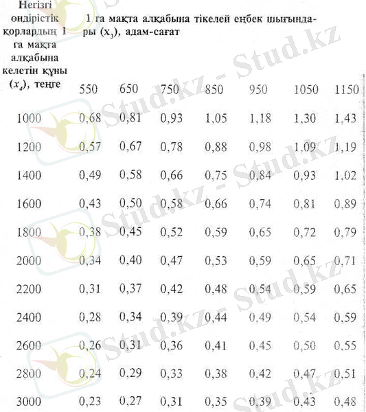 х 4 1 га мақта алқабына келетін негізгі өндірістік қорлар. Адам еңбегін негізгі өндірістік қорлармен " алмастыру нормасын анықтаған соң төмендеп моделде есептеулер жасалған: