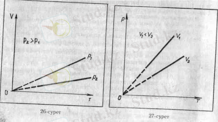 Бұл тәуелділік графикте түзумен кескінделеді де, ол изохора деп аталады (27-сурет) . Түрлі көлемге түрліше изохора сәйкес келеді. Температура тұрақты болғанда, Бойль - Мариотт заңына сәйкес, газ көлемі ұлғайғанда оның қысымы азаяды. Сондықтан үлкен V 2 көлемге сәйкес келетін изохора, кіші V 1 көлемге сәйкес келетін изохорадан төмен жатады. (3. 10) -теңдеуге сәйкес барлық изохоралар Т = 0 нүктесінен басталады. Демек, абсолют нөлде идеал газдың қысымы нөлге тең.