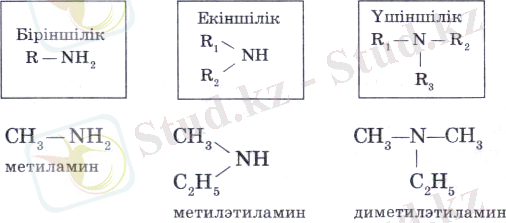 Аминдерді аммиак (NН 3 ) молекуласындағы сутек атомдарының орнын басқан радикалдардың санына қарай үш топқа бөледі