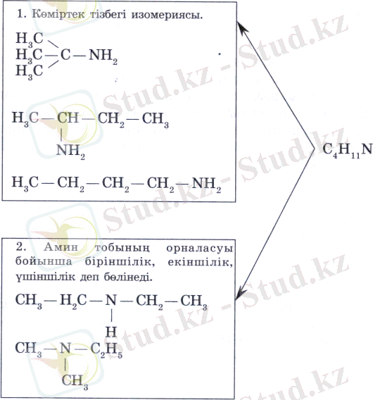 Изомериясы. Аминдерде тізбек жөне радикалдың орналасу нзомериялары болады. Мысалы: