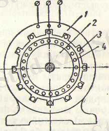 1- статор, 2 - ротор, 3 - статордың обмоткасы, 4 - ротордың обмоткасы.