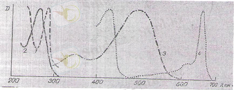- суретте күн сәулесінің көрінетін және ультракүлгін аймағындағы кейбір маңызды биологиялық қосылыстардың спектрі берілген: