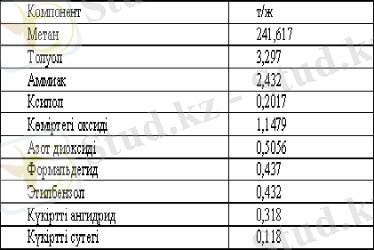 Қатты тұрмыстық қалдықтардың ыдырауы кезінде пайда болатын ластаушы заттектердің мөлшерін есептеу және олардың Тараз қаласы ауа бассейніне сейілуі 1- суретте келтірілген. Зиянды бейорганикалық заттектердің күл тозаңы 0, 083 ШРК, азот оксиді 0, 124 ШРК, аммиак 0, 113 ШРК, күкіртсутегі 0, 137 ШРК, формальдегид 0, 199 ШРК көрсетіп, пайдаланылатын қалдық үйіндісінен атмосфералық ауаға шығатын зиянды заттектер санитарлық қорғау аймағынан ауытқуы арқылы қоршаған ортаны ластайтыны дәлелденді.