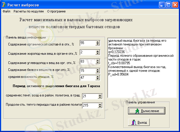 - қатты тұрмыстық қалдықтар полигонында ластаушы заттар шығарындысын және ауа бассейнінде әрбір құрауыштың сейілуін есептеу;
