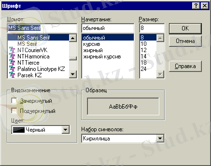 Font ( Шрифт) - фррмаға енгізілетін мәтін шрифтін орнату қасиеті. Оны таңдап, оң жағында көрінген көп нүкте ( . . . ) түймесін шерткен кезде сұқпаттық шрифт таңдау терезесі көрінеді (1. 3 - сурет) . Терезеден әдеттегідей, қажетті шрифт типін өлшемін таңдап ( мысалы, Times Kaz, 10), ОК түймесін шерту керек .