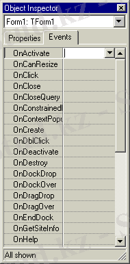 Форманы не онда орнатылған компонентті программа құру үшін дайындау оның кейбір қасиеттерінің мәндерін өзгертуден басталады. Қасиеттер тізімі Объект инспекторы (Object Inspector) терезесіне енгізілген. Тізімді инспектор терезесіне шығару үшін сәйкес объектіні (форманы не формада орнатылған форма компонентін ) бір шерту арқылы таңдау керек. Инспектор терезесінің жоғарғы қатарына таңдалған объект атауы да жазылып қойылады. Мысалы, Delphi іске қосылған кезде форманың ашылған қасиеттер терезесі 1. 1-суретте көрсетілген. Терезенің екі қосымша беті бар: Properties (Қасиеттер) және Events ( Оқиғалар) . Терезеашылғанда екі бағанға енгізілген жазулардан тұратын оның Properties бөлімі ашылулытұрады. (1. 1-сурет) Бірінші бағанда көрінетіндер - қасиет атаулары, екінші бағанға сәйкес жазылғандар-олардың мәндері.