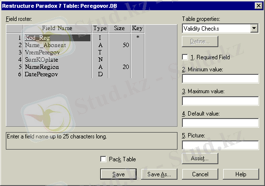 Мысалы, Database Desktop арқылы Пункт коды, Абонент аты-жөні, Сөйлесу уақыты, Төлем ақы сомасы, Пункт атауы, Сөйлесу күні құрылымды Peregovor. db кестені (1. 1-кесте) құру үшін алдымен өріс атауын сипаттау терезесін 1. 9-суреттегі сияқты толтыру керек.