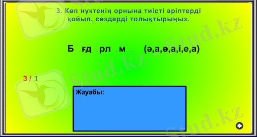 - оқушының сөз-логикалық ойлауын дамыту мақсатында нақты әріпке байланысты сөзді қатесіз теріп шығуы үшін компьютердің дыбыстауы арқылы сол сөз қайталанып отырады, оқушыға ести отырып сөзді теріп шығуына мүмкіндік беріледі;