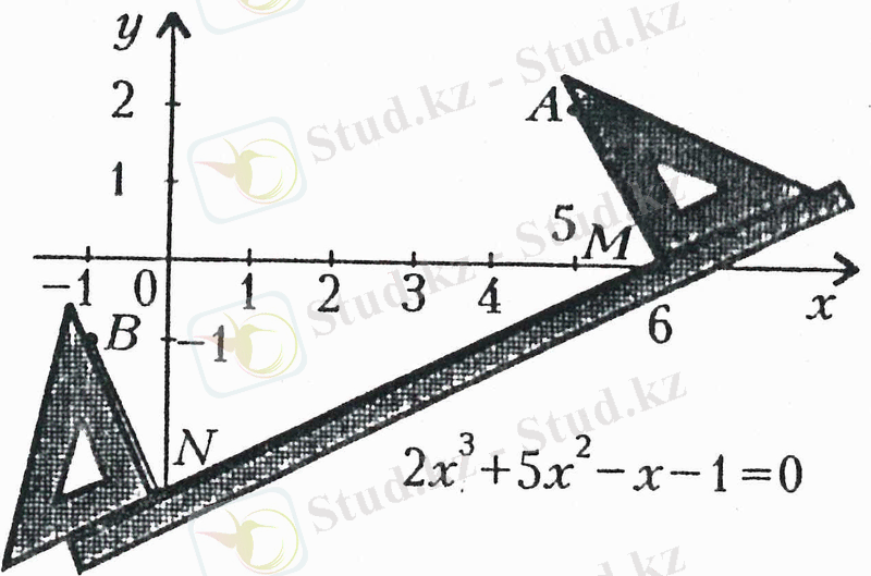 Циркуль және сызғыш көмегімен шешуге болмайтын көптеген есептерді басқа құралдар немесе сызғыш көмегімен шешуге болады. Дәл солай, үшінші дәрежелі теңдеулерді екі тік бұрышты үшбұрыш және сызғыш көмегімен шешуге болады. Ол үшін тік бұрышты координаталық хоу жазықтығында А(b; а), B(d; c) (сурет 1 ) нүктелерін белгілейміз. Егер А нүктесін сызық абцисса осіне (сурет 1-дегі М нүкте) В нүктесін ордината осіне әр жолы 90 0 бұра отырып, А нүктесінен В нүктесіне баратын болсақ х 0 = (x m - b) /a болады. Мұндағы x m - М нүкте абциссасы, х 0 (*) теңдеудің нақты түбірі болады.