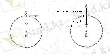 Сурет-5. S Күннің Е Жерден айналысының көрінетін тәуліктік қозғалысы Күннен үдемелі Жерге бағытталған. Бұл жағдайда Жерге бағытталған Кориолис күші, Жерден бағытталған центрден тепкіш күштен екі есе артық.