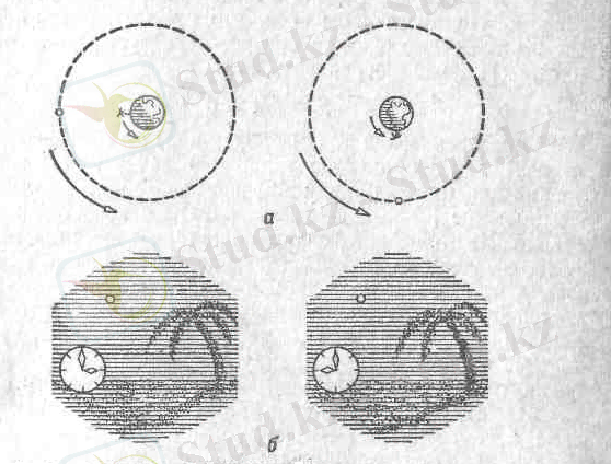 Сурет-3, а - Жер экваторының жазықтығын 24 сағат периодпен айналған спутник. б - бұл жасанды серіктің белгісіз күш арқылы ілінуі экваторда өзгеріссіз көрініп тұр.