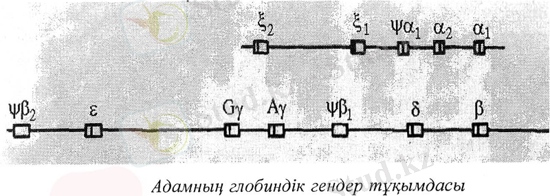 11) әр түрлі ұлпалардан әр түрлі мүшелер түзіледі. Дифференциацияланудың молекулярлы-генетикалық негізі - әр ұлпаға тән гендердің арнайы белсенділігі болып табылады. Ағзаның барлық сомалық жасушаларында бірдей гендер жиынтығы болғанымен, олар морфологиялық, биохимиялық және функциональдық қасиеттері бойынша бір-бірінен ерекшелінеді. Әртүрлі гендердің әр түрлі жасушалардағы активті жұмыс істеуі осы айырмашылықтардың негізінде жатады. Әр ұлпада сол дифференциациялануға жауапты гендер ғана активті болады. Дифференциациялану факторлардың ролі сол гендердің таңдамалы активациясына (қосылуға) негізделген. Белгілі бір гендердің активтілігі дифференциациялануды анықтайтын сәйкес белоктардың синтезіне әкеледі. Сонымен, онтогенезде ағзаның жасушаларында белсенді қызмет атқаратын гендердің ауысу процесі жүреді. Эмбриональды кезенде транскрипцияланған гендер туылу кезінде репрессияланады. Бұл уақытта ересек ағзаға тән гендер активтелінеді. Осыған гемоглобин гендері мысал бола алады (1 сурет) . Адам эмбрионында эмбрионалъдық ζ 2 ε 2 гемоглобиндерінің түзілуін қамтамасыз ететін гемоглобиннің а туысынан шыққан ε (дзета) және р -туысынан шыққан ε (эпсилон) глобиндік гендер активті болады. Онтогенездің кеш сатыларында бұл гендер репрессияланады, бірақ фетальды гемоглобин а 2 у 2 синтезін анықтайтын басқа гендер дерепрессияланады. Туылғаннан кейін ересек адам гемоглобин синтезін қамтамасыз ететін δ (дельта) және β (бета) -глобиндік гендер экспрессиялана бастайды. Гендердің дифференциальды экспрессиясы басты механизмі болып табылады. Гендердің дифференциальды экспрессияның реттелу деңгейі ген -> полипептид -> белгі бағыттағы ақпараттың жүзеге асырылуы.