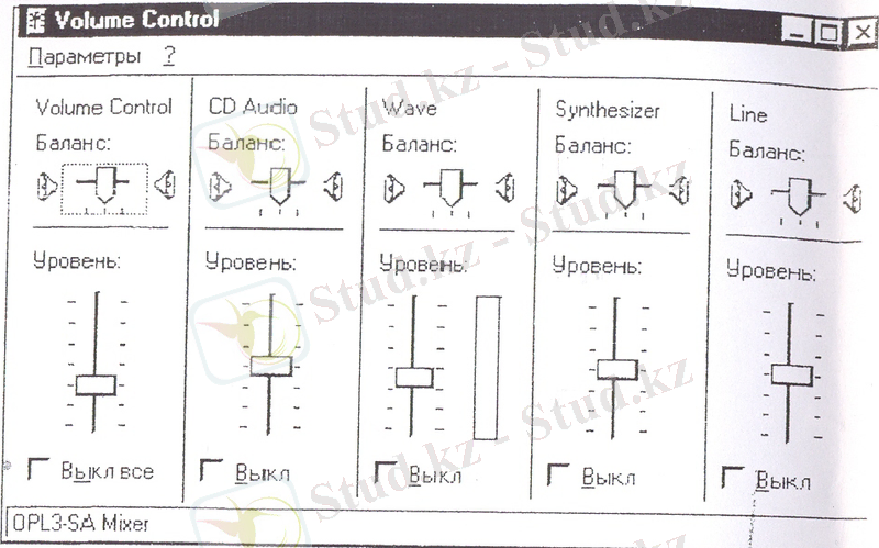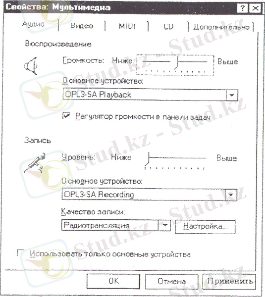 Бас менюдегі Программалар - Стандартты - Мультимедиа -Деңгейлерді реттеу командасын орындағаннан кейін тыңдау және жазу дыбыстарының қаттылығын реттеу мүмкіндігін беретін терезе ашылады. Егер бұл терезеде өзімізге қажетті құрылғы жоқ болса, оны Параметрлер- Қасиеттер командасын орындау арқылы ашылған терезеде берілген тізімнен таңдап аламыз.