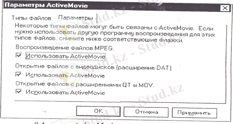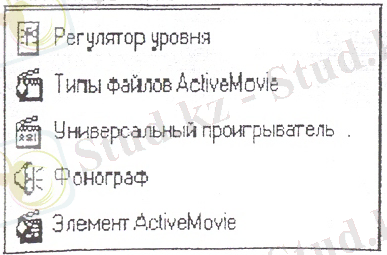 Бас менюдегі Программалар- Стандартты- Мультимедиа- ActiveMovie файлдарының типтері командасы орындалғаннан кейін, дыбыстық файлдармен жұмыс істеу процесінде ActiveMovie программасын қолдану немесе қолданбау мүмкіндігін ауыстырып қосу терезесі ашылады. Егер басқа программа қолданатын болсақ, жалаушаларды тышқанмен шерту арқылы алып тастаймыз.