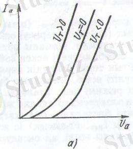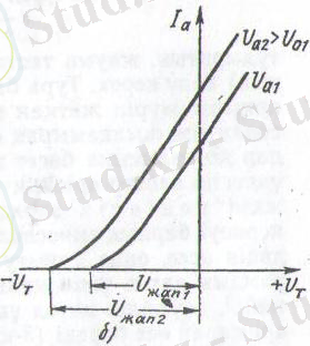 8, а- суретте тор кернеуі тұрақты болған кезде (Uт=const) анодтық токтың анодтық кернуеге тәуелділігін көрсететін Іа=f Ua триодтың анодтық сипаттамалары бейнеленген. Тор кернеуінің нольге тең (Uт=0) мәнінде триодтың сипаттамасының диодтың анодтық сипаттамасынан іс жүзінде айырмашылығы жоқ. Тордың кернеуі оң болғанда Uт>0, анодтық ток артады және сипаттама Uт=0 болғанда алынған сипаттамаға қарағанда солға қарай және үлкен болған сайын сонша жоғары орналасады. Егер анодтық сипаттаманы тордың біршама теріс кернеуінде (Uт<0) түсіріп алсақ, онда ол сипаты мен көлбеулігін сақтай отырып, тым жоғары кернеулер аймағына қарай жылжиды, яғни Uт=0 болғанда түсіріп алынған сипаттаманың оң жағына орналасады. Кішкене анодтық кернеулерде шам тордың теріс кернеуімен жабылады да анодтық кернеудің мәні анодтың үдеткіш өрісі тордың тежегіш өрісін толығымен жоятын U2-ге жеткен кезде қайта ашылады. Тордың теріс кернеуі қанша үлкен болса, шамды ашатын анодтық кернеудің мәні сонша үлкен болады.