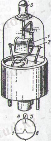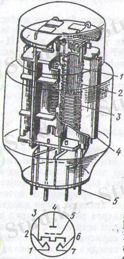 құрылысы: 1- қыздырғыш, 2- катод, 3- тор, 4- анод, 5- сыртқа бөліп шығару
