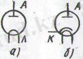а- тікелей қыздыру катодымен, б- жанама қыздыру катодымен, А- анод, К- катод
