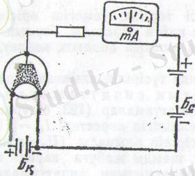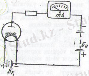 Катод немесе қыздыру қыл сымдары (қыздырғыштар) кернеуі бірнеше вольт қыздыру батереясы Бқ- дан немесе трансформатордың орамасынан қоректенеді. Қызған катод электрондарды эмиссиялайды, егер анод пен катодтың арасында үдеткіш электр өрісі бар болса, яғни шамның аноды анод батереясы Ба- ның оң полюсімен, ал катод теріс полюсімен қосылса, (4, а- сурет) онда электронда анодқа қарай ұмтылады. Катодтан эмиссияланған, анодқа жеткен электрондар тізбекте анод тогы Іа- ны (диод ашық) тудырады, ал шамның аноды мен катодының арасындағы потенциалдар айырмасы анодтық кернеу Uа болып табылады. Шамдағы анод тоғының бағыты электрондар қозғалысының бағытына қарама- қарсы.