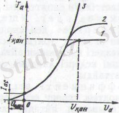Ашық диодта анодтың кернеу өскен сайын арта түседі. Анод тоғының қыздыру кернеуі тұрақты болғанда Uқ- const, анод кернеуіне тәуелділігі Іа=f(Ua) диодтың анодтық немесе вольтамперлік сипаттамасы деп аталады (5 - сурет) . Анодтық кернеу U=0 болғанда диод арқылы анодқа жетуге жеткілікті кинетикалық энергия қоры бар электрондар тудыратын шамасы кішкентай диодтың бастапқы тоғы Іа 0 жүреді. Осы тоқты нольге дейін азайту үшін шамға тежегіш электр өрісін тудыратын, жауып тастайын кері кернеу Uжап (шамасы І В болатын) беру керек. Тура бағыттық (оң) анод кернеуі өскен кезде шам арқылы жүріп жатқан ток бастапқыда шамала ортая бастайды, содан соң жылдамырақ өседі, себебі кернеуі өскен сайын электрондар қозғалысына бөгет жасайтын теріс көлемдік заряд азаяды да, үдеткіш электр өрісінің кернеулігі өседі. Лампаның бұл жұмыс режимі кеңістік зарядының режимі деп аталады. Егерде анод кернеуі барлық эмиссияланған электрондар анодқа жететін шамаға дейін өссе, онда қанығу режимі басталады, бұл жағдайда вольфрамдақ катод үшін қанығу тоғы Іқал (1- қисық) іс жүзінде өзгермейді, барийлік катод үшін шамалы өседі, ал оксидтік катод үшін әрі қарай өсе береді(3- қисық) .
