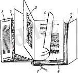 1 - сыртқы қаптау бетінің бүктемесі (суперобложка) ; 2 - форзац; 3 - фронтиспис; 4 - титульды бет; 5 - сыртқы қаптау бетінің бүктемесі (суперобложка) ; 6 - кітап бөлігі; 7 - ляссе (Сурет 2) .