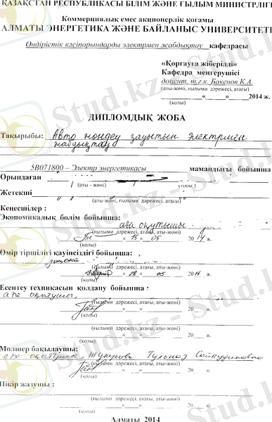 Дипломдық жобада авто-жөндеу зауытының электрмен жабдықтау жүйесін жобалауға арналған. Жұмыста бүкіл зауыт бойынша жүктемеге есептеу жүргізілген, электрмен жабдықтаудың ең тиімді сұлбасы таңдалған (екі нұсқаны салыстыру арқылы), 110 кВ және 6 кВ шиналарындағы қысқа тұйықталу тоқтары есептелініп, олардың нәтижелері бойынша электр жабдықтары таңдалды.