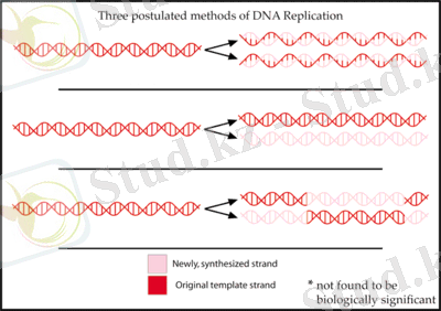 2. Суретте ДНҚ репликациясының болжамды үш түрлі механизмі берілген. Осы үш механизмнің қайсысы дұрыс және осы механизмдерді суреттен көрсетіңіз.