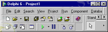 - Delphi 6 - Project 1, яғни Delphi сізге бірінші жобаңызды құруға нұсқау береді және оған Project 1 деген ат тағайындайды. Төмен қарай негізгі меню, 16 батырмадан тұратын құрал-саймандар панельі және құрауыштар палитрасы орналасқан.