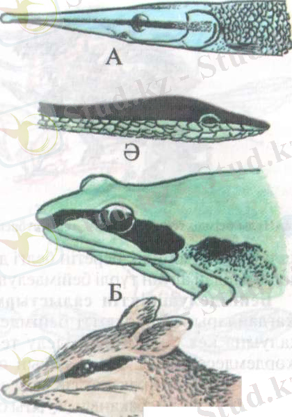 Жасырушы рен. Кейбір омырт- калыларда көзін жасыратын кара жолактын болуы. А - балык, Ә - жылан, Б - бака, В - сүткоректі.
