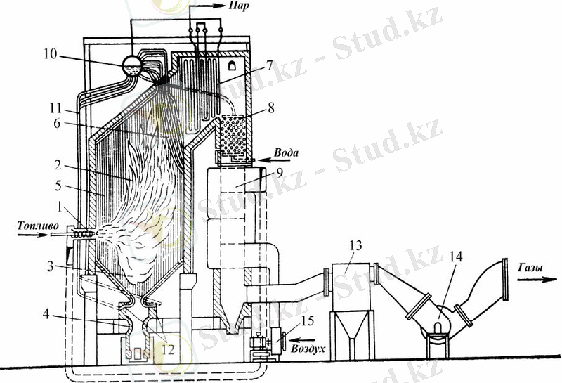 1 - оттық; 2 - от жанатын жер; 3 - суық шұңқыр; 4 - күлді шахта; 5 - экран трубалары; 6 - фестон; 7 - бу қыздырғыш; 8 - су үнемдегіш; 9 - ауа қыздырғыш; 10 - дағыра; 11 - жылжымалы трубалар; 12 - коллекторлар; 13 - күлтұтқыш; 14 - түтінтартқыш; 15 - желдеткіш.