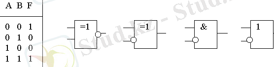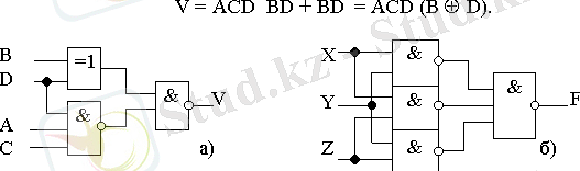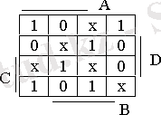 Жалпы жағдайда төрт айнымалының логикалық функциясы, кіріс айнымалыларының 16 теріміне анықталған. Берілген мысалда 10 ғана қолданылады. Бульдік функцияны минимизациялау кезінде ол бұл терімдерде өз қалауы бойынша анықталуы мүмкін (сур. 4. 3, в) . Бірлік бойынша блокты ұйымдастыра отырып (бұл жағдай үшін блоктар Карно картасында белгіленген), 4. 4 сур. көрсетілген іске асыру варианты сәйкес келетін, логикалық функция үшін теңдікті мына түрде