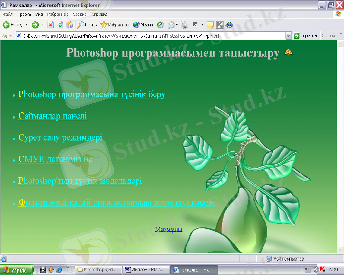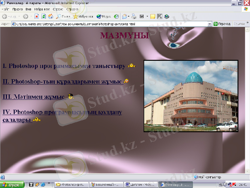 Менің дипломдық жұмысым “ HTML тілінде Adobe Photoshop программасының қолдану оқулығын дайындау. ” Оқулығымның мазмұны төрт тараудан тұрады. Олар: