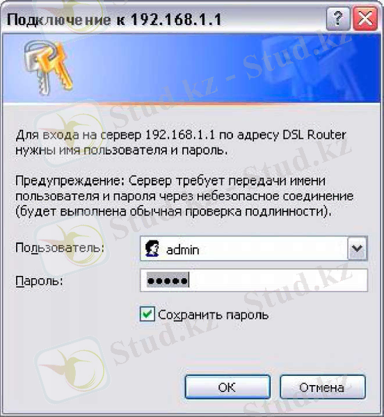 - Құрылғының WEB интерфейсіне қолжеткізуге арналған логин/пароль енгізуге арналған терезе пайда болады, «Пайдаланушы» алаңында admin теріңіз, «Пароль» алаңында да admin теріңіз. «ОК» батырмасын басыңыз.