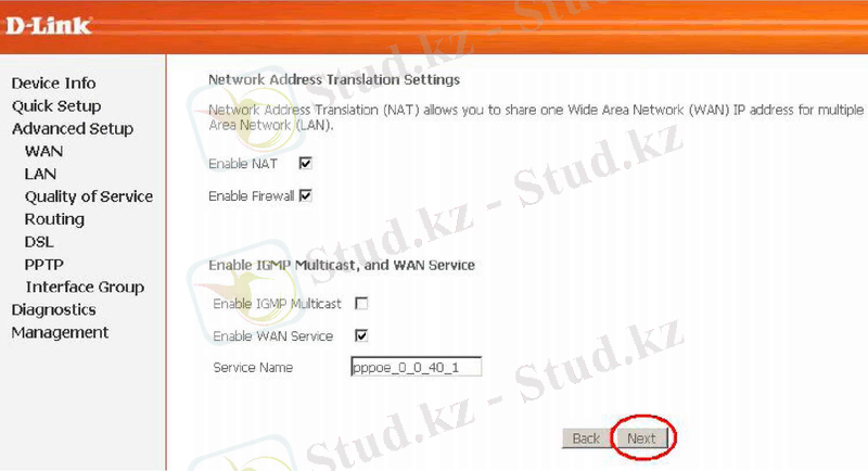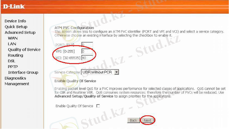 - Пайда болған бетте VPI және VCI параметрлерінің мәндерін көрсетіңіз (0 және 40 сәйкес) және «NEXT» батырмасын басыңыз.