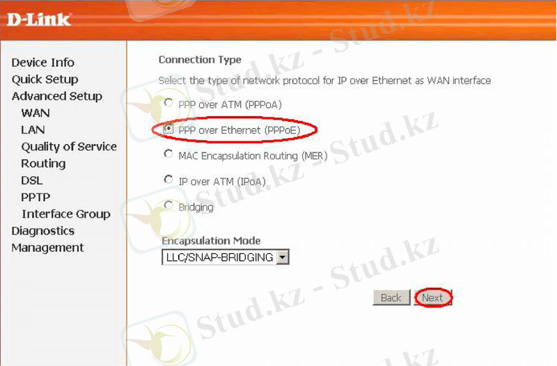 - Келесі бетте «PPP over Ethernet (PPPoE) » нұсқасын таңдаңыз да «NEXT» батырмасын басыңыз.
