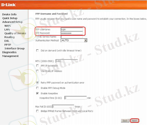 - Келесі бетте «PPP Username» және «PPP Password» алаңдарында Өзіңіздің провайдеріңізбен берілген логин мен парольді көрсетіңіз, қалған ретке келтірулерді өзгертусіз қалдырыңыз және «NEXT» батырмасын басыңыз.