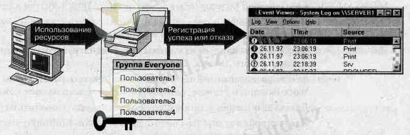 - Аудит жасауға қажетті файл, папка, принтерді таңдау, және де әрекетін бақылауға алатын қолданушылар мен топтарды таңдау. Папкалар мен файлдарға аудит орнату үшін Windows NT Explorer (Проводник) бағдарламасын қолданыңыз; принтер аудиті Printers (Принтеры) терезесінде орнатылады.