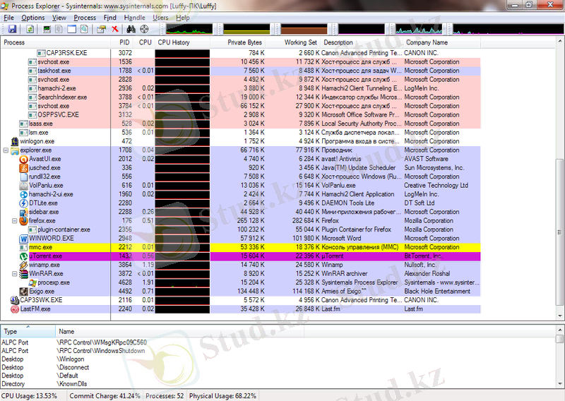 Process Explorer - жүйедегі процессорлар мониторингіне арналған бағдарлама. Бұл бағдарламаны қолдана отырып тек белгілі бір процесті бақылаудан өзге, осы процесс қолданатын файлдар мен папкаларды көруге болады(12-сурет) .