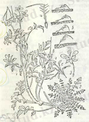 азыққурайлы аистник (Erodium cicutarium) : 1 -гүлден тұрған жемісті бұтақтар, 2 - жапырақ делегі, 3-гүлі, 4-жемісінің, жерге бойлап енуі