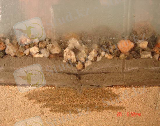 Модельдік эксперименттердің нәтижесі 12 суретте көрсетілгендей, полиэтилен қабатын - «сүздірмейтін экран» тескенен кейін сұйықтың ағуын қамтамассыз ететін гидрогельдік қабат сумен араласа отырып ісінеді де, судың ағатын тесіктерін толық бітейді және құмға ылғал өткізбейді.