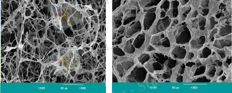 Гидрогельдің құрылысы аморфты және кеуекті болып келеді (Сурет 3) . Кеуектің өлшемі оншақты нонометрден бірнеше оншақты микрометрге дейін кеңінен өзгере алады.