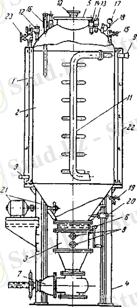 1 - корпус; 2 - жиде; 3 - ашытқы бөлгіш; 4 - тұрақтандырғыш; 5 - люк; 6 - екіншілік түп; 7 - төгетін шүмек; 8 - терезелер; 9 - хлад-агенттің кіріп шығуы; 10 - саңылау; 11 - компенсатор; 12-15 - құбырөткізгіштер; 16 - тер-мометр; 17 - манометр; 18 - тетік; 19 - таңбалы кран; 20 - штуцер; 21 -араластырғыш; 22 - изоляция; 23 - вентиль.