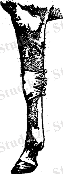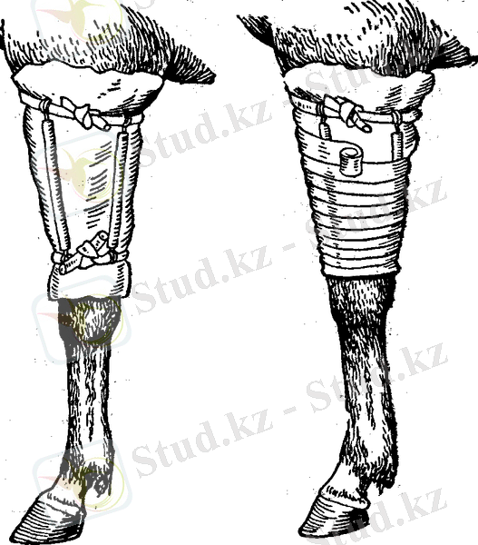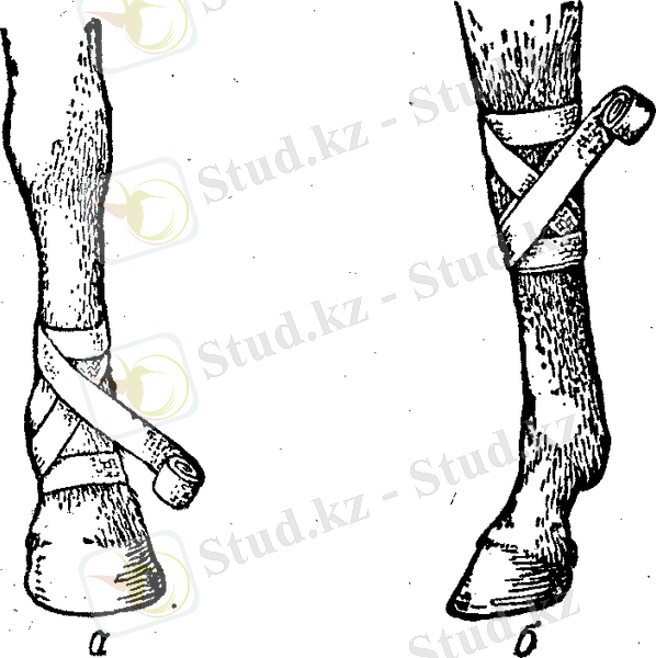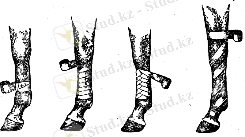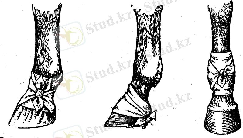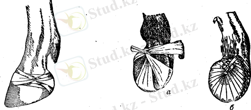 . Жылқылардың тұяқ астындағы ойыстар кезінде және табанында саңылаулар болған кезде күкіртті мақтамен толтырылып жебе тәрізді етіп байланады. Байламды тұяқтан жоғары етіп бірнеше турлармен бастайды. Дәкенің басынан ұзындығы 20-25 см орын бос қалдырады. Содан кейін дәкені тұяқтың оралған бөлігіне орайды және оның бастапқы қалған бөлігіне орайтын өкшелік бұрышқа қайтып келеді. Дәл солай барлық тұяқтарды бірінен кейін бірін дәкемен орап шығады (ірі қара малдың және шошқаның тұяғы) .