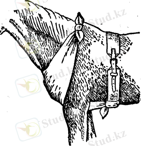 . Құлақ қалқанының қуысын мақтамен немесе мақталық-дәкелік тампонмен алдын-ала толтырып, майлықпен жауып қояды. Құлақ қалқанының негізіне, циркулярлық-дәкелік таңғыштың бірнеше турларын үстіне қояды, содан кейін көмей аумағы арқылы мойынның айналасын дәкемен айналып өтеді. Құлақ қалқанына қайтқаннан кейін, оны шиыршық турлармен бастапқысынан жоғары және кері-жоғарыдан бастапқысына жабады. Мойынның айналасына дәкенің бірнеше турлы таңғышын аяқтайды. Ірі мүйізді малдың таңғышын, мүйізге қойылған, бірнеше сегіздік тәрізді турлармен бекітеді;