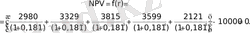 Ішкі табыстылық мөлшерін анықтау үшін кезекпе-кезек әдіспен таза келтірілген табыстың мөлшері нөлге тең болатын жағдайға дейін дискоттау коэффициентінің мәнін өзгертіп отырамыз. Біздің мысалымызда ішкі табыстылық мөлшері IRR= r = 18, 1% тең болады; сәйкесінше