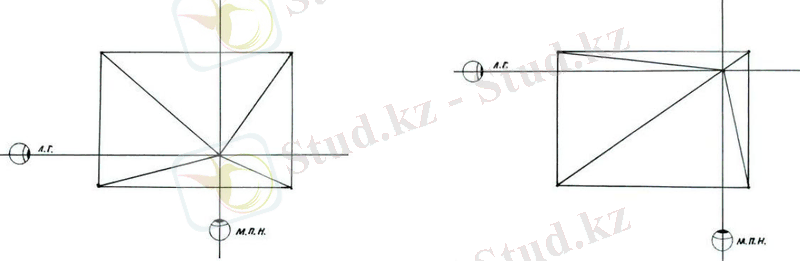 Көлбеу сызықтары қиылысатын нүктені - қиылысу нүктесі деп атайды. Қиылысу нүктесі әрқашан горизонталь сызықта орналасды(сурет. 6) .